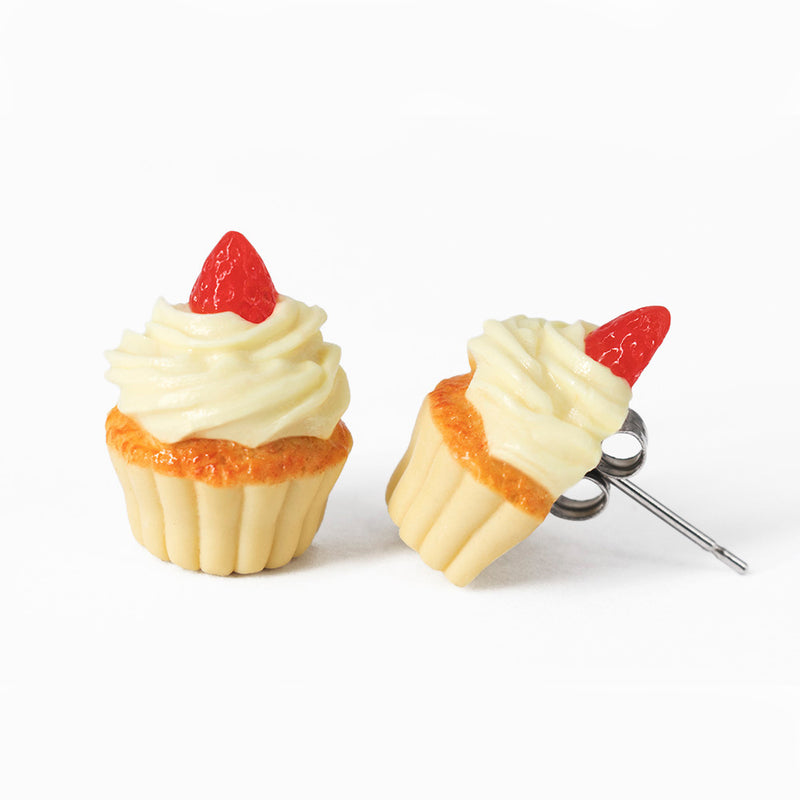 One pair, handmade polymer clay cupcake stud earrings topped with strawberry. Made in USA